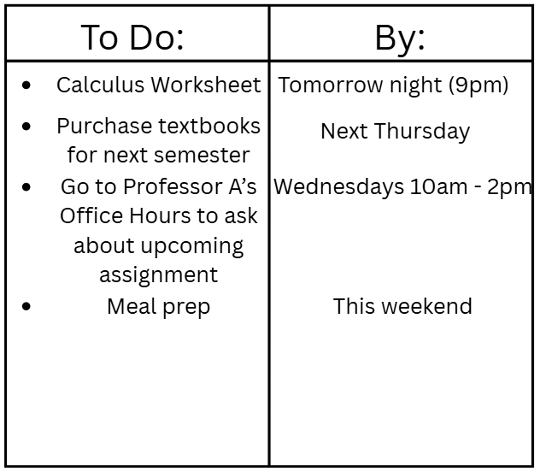 Let’s say you have a calculus worksheet due tomorrow morning. Rather than waiting until you are home for the evening to complete it all in one sitting, make each question on the worksheet an individual task. If each question takes 5 minutes, it will feel a lot more approachable than if you were to complete all the questions in one sitting. With a worksheet, the professor has made the task division quite easy whether you choose to do it by question, or in sections. Let’s look at a more complex example.